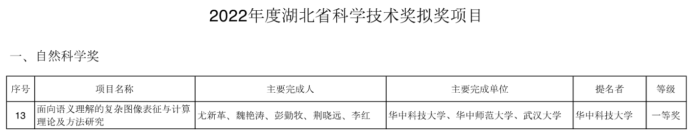 尤新革教授牵头的“面向语义理解的复杂图像表征与计算理论及方法研究”项目荣获2022年度湖北省自然科学奖一等奖。