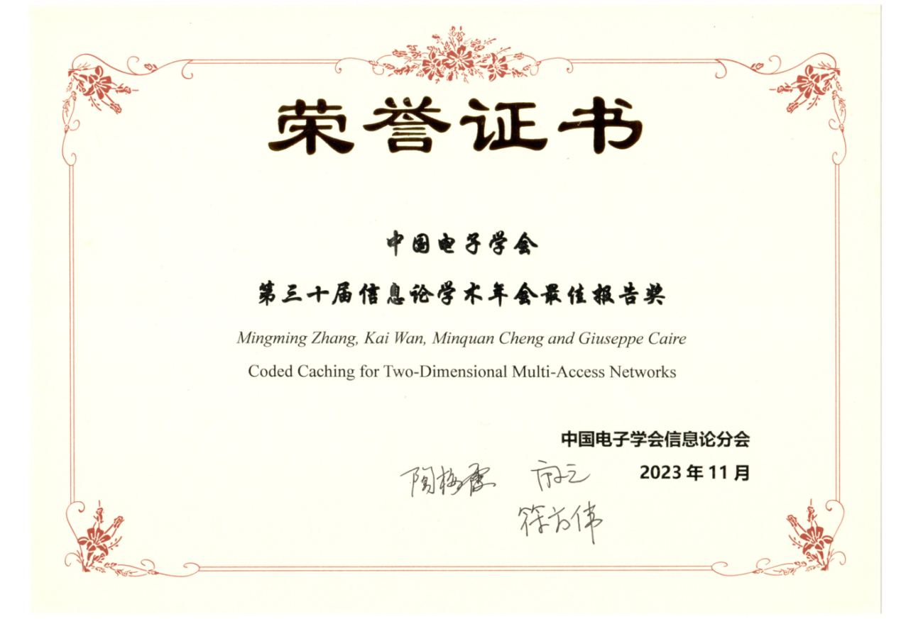 此外,万凯博士还获得了CIEIT 2023的最佳论文奖(大会唯一一篇,合作单位包括西安交通大学,西安电子科技大学)和最佳报告奖(合作单位包括广西师范大学和德国柏林工业大学)。这两篇文章分别针对双基站通信感知一体化系统和多节点边缘缓存系统,提出高效的传输方案,再通过信息论逆证明,刻画系统性能极限的上下界。