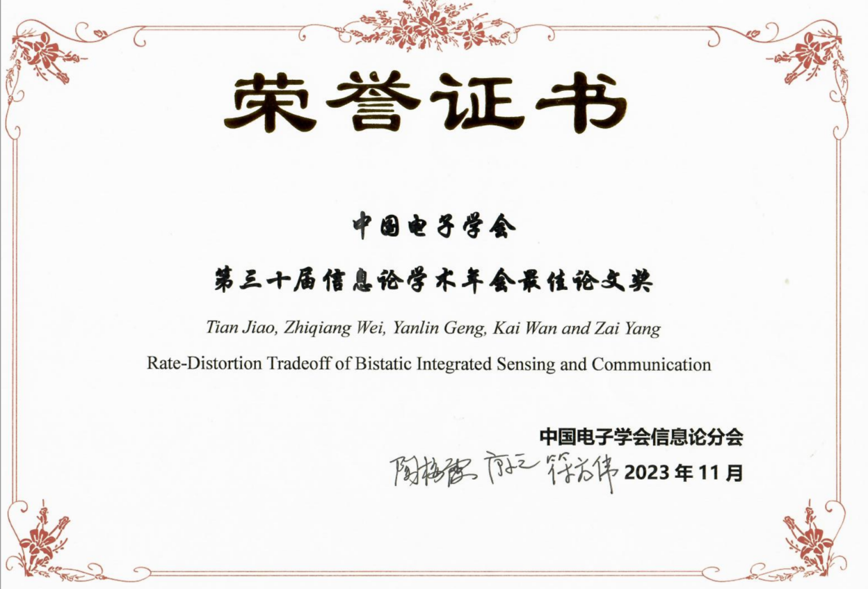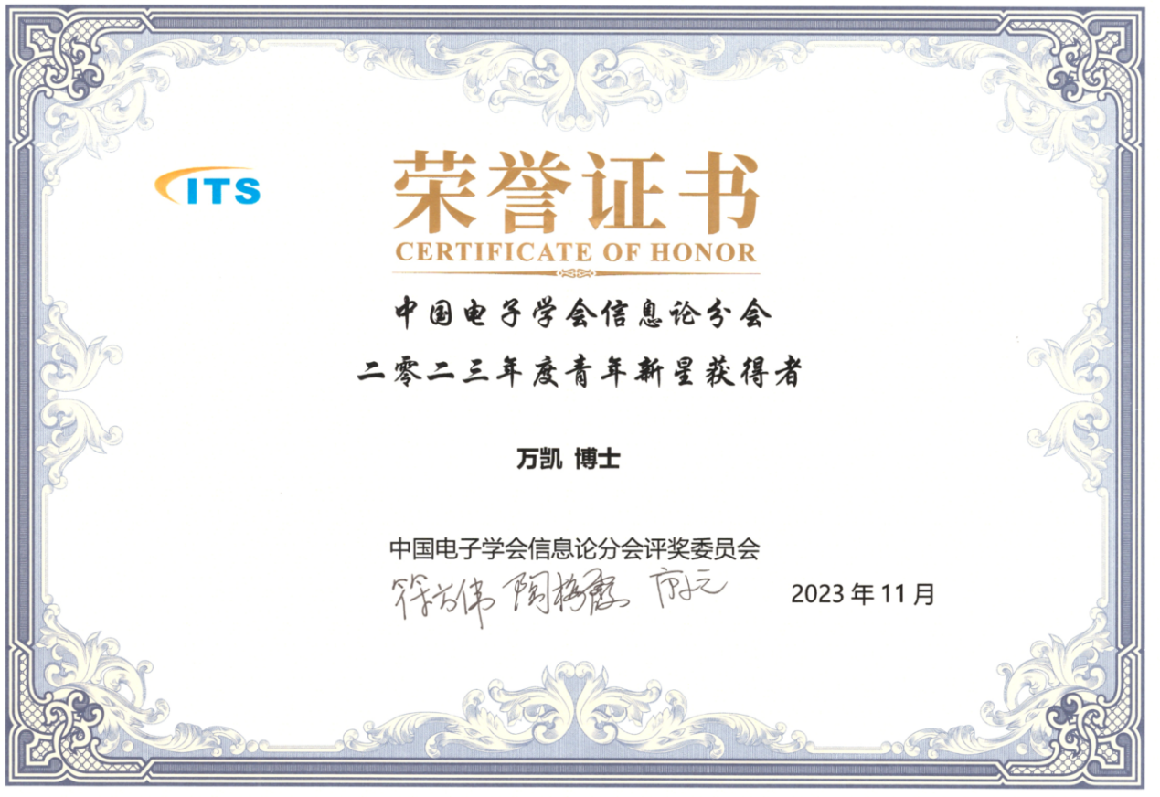 11月24日至26日,中国电子学会第三十届信息论学术年会CIEIT 2023在广州举行。我院研究员万凯博士荣获中国电子学会信息论分会青年新星奖、CIEIT 2023最佳论文奖和最佳报告奖。