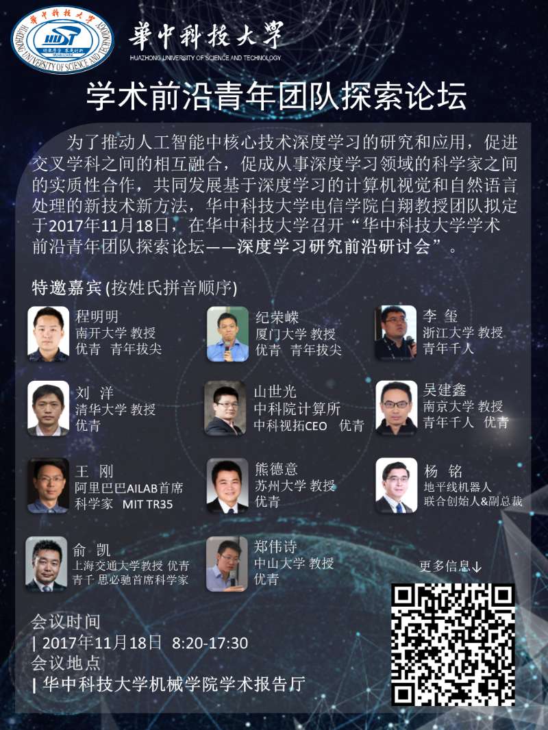 为了推动人工智能中核心技术深度学习的研究和应用,促进交叉学科之间的相互融合,促成从事深度学习领域的科学家之间的实质性合作,共同发展基于深度学习的计算机视觉和自然语言处理的新技术新方法,我院白翔教授团队拟定于11月18日在校召开“咕咕番 学术前沿青年团队探索论坛——深度学习研究前沿研讨会”。详见: