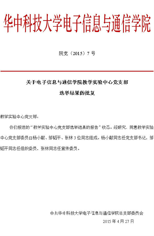 院党(2015)7号 关于咕咕番 教学实验中心党支部选举结果的批复