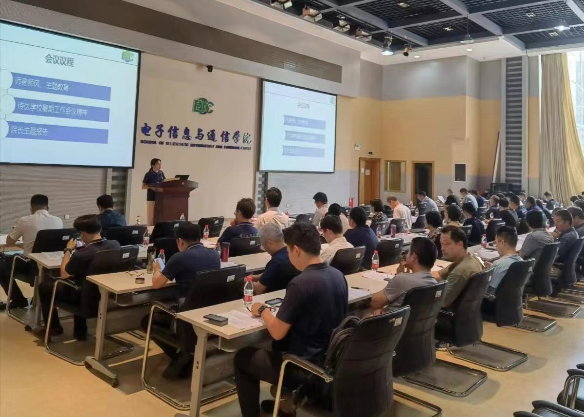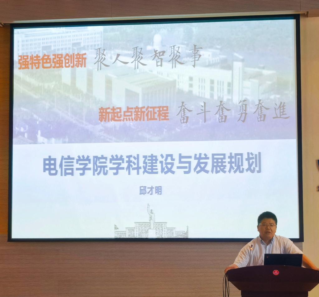 学科建设与发展规划的报告。他从规划背景、战略任务、思路举措、组织保障四个方面,结合国家战略需求和学校对信息学科的定位要求,剖析了学院和学科建设面临的机遇和挑战。他指出近年来学院在人才培养、科学研究等方面聚力发力,成果迭出,呈现出党政齐心,全员合力,同心同德,焕然一新的气象面貌。学院将以学校“人才培养与教学研讨年”为契机,狠抓教风学风建设特别是课堂教学秩序;坚持“感-通-算一体化”和“元宇宙”学科特色,推动有组织培养拔尖创新人才、有组织推进科技创新、有组织服务国家和区域经济社会发展,积极推进中移动联合研究院、元宇宙交叉研究中心等平台建设,积极承担重大战略性、基础性、前瞻性科研任务,试点实施科研团队建设,群策群力、主动作为,力求学科建设取得实质性新突破。