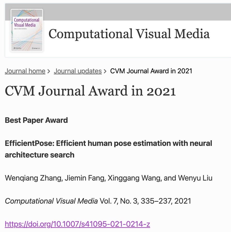 师生论文“EfficientPose: Efficient Human Pose Estimation with Neural Architecture Search” 获得Computational Visual Media (CVMJ, 计算可视媒体) 2021年度最佳论文奖(Best Paper Award)。论文共同第一作者为咕咕番