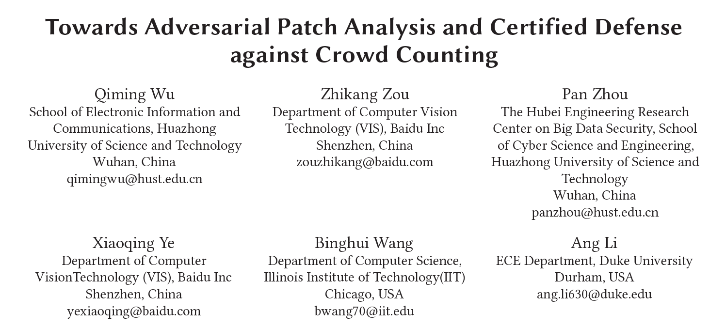 18级本科生吴启铭同学以第一作者身份的论文 ”Towards Adversarial Patch Analysis and Certified Defense against Crowd Counting” 被录用!