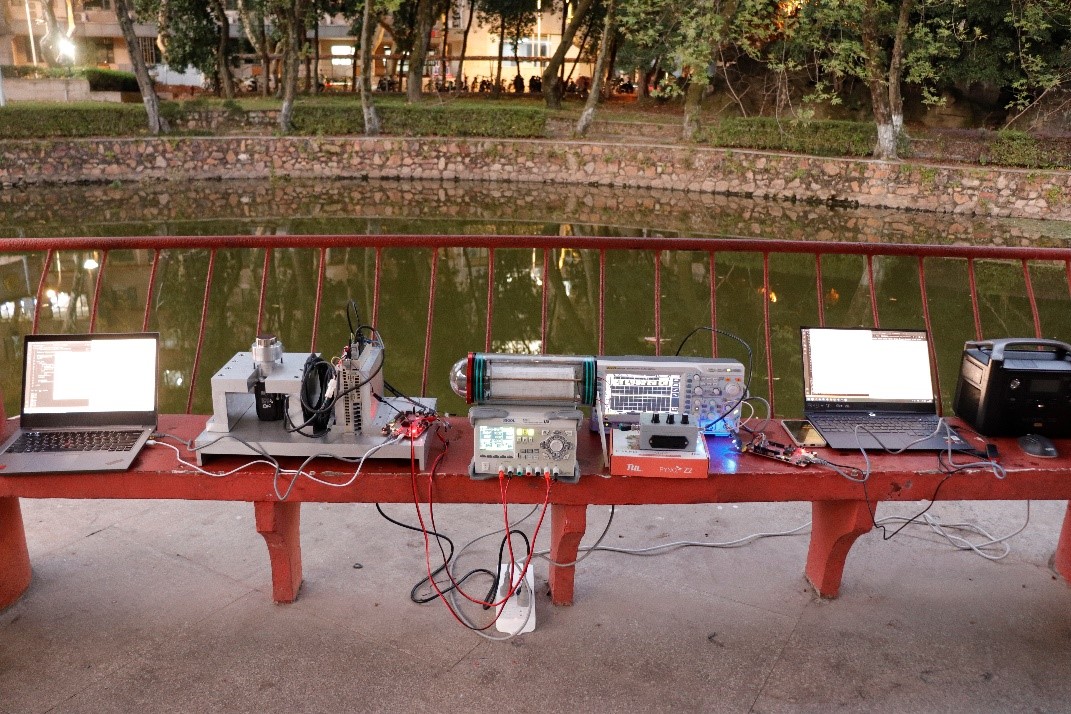 研究生黄运龙、汪思翔和本科生刘可立,以“老”带“新”,协作攻关。从理论研究到原型验证平台开发,从室内水箱测试、到室内水池测试、再到室外湖泊测试,团队历时两年,攻克多项技术与工程难题。经过广泛的测试验证,系统功能逐步完善,目前已实现中心频率、可用带宽、发射增益、编码方式、编码率、调制阶数、载波数量等主要通信与信号处理算法/参数的可软件定义,可实现文本、语音、图像、视频等数据的实时采集、发送、接收和显示。