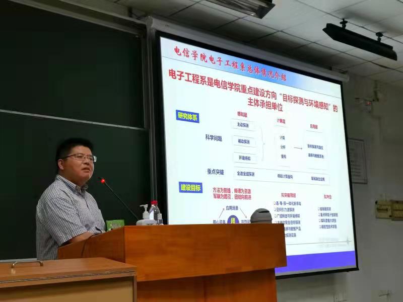 邱才明首先整体介绍了学院历史沿革、综合实力、学科建设、人才培养特色、重大科技成果、优秀校友代表等情况,指出了电子信息工程通信工程电磁场与无线技术三个专业的定位、建设情况及发展前沿,介绍了各专业方向与国家重大需求、社会服务相结合的情况,并展示了学院在****领域等国家主战场上的科研成就。为让新生对专业有更深层次的认知,邱才明从解读电磁波与电磁波谱等基础概念出发,梳理了电磁学的发展历史脉络,向同学们分享了伟大物理学家探索真知、发现真理的故事。