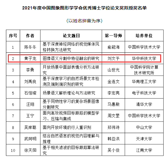刘文予教授指导的2020届博士毕业生黄子龙荣获2021年度中国图象图形学学会优秀博士学位论文奖。