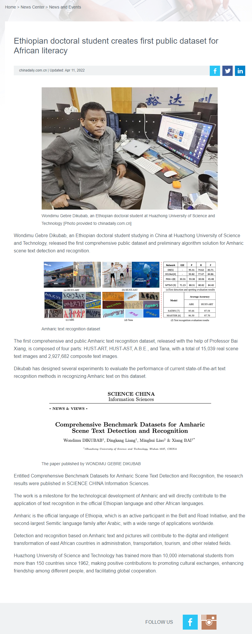 China Daily 报道我院国际学生发布首个面向非洲文字理解的公开数据集://studychina.chinadaily.com.cn/s/202204/11/WS62552561498e6a12c1229b6b/ethiopian-doctoral-student-creates-first-public-dataset-for-african-literacy.html?fbclid=IwAR2Hr1OmWGdv_Do1idPlf7fvfKxObobVYv570x5Z4VEzdrCVhhMfgj-VssQ