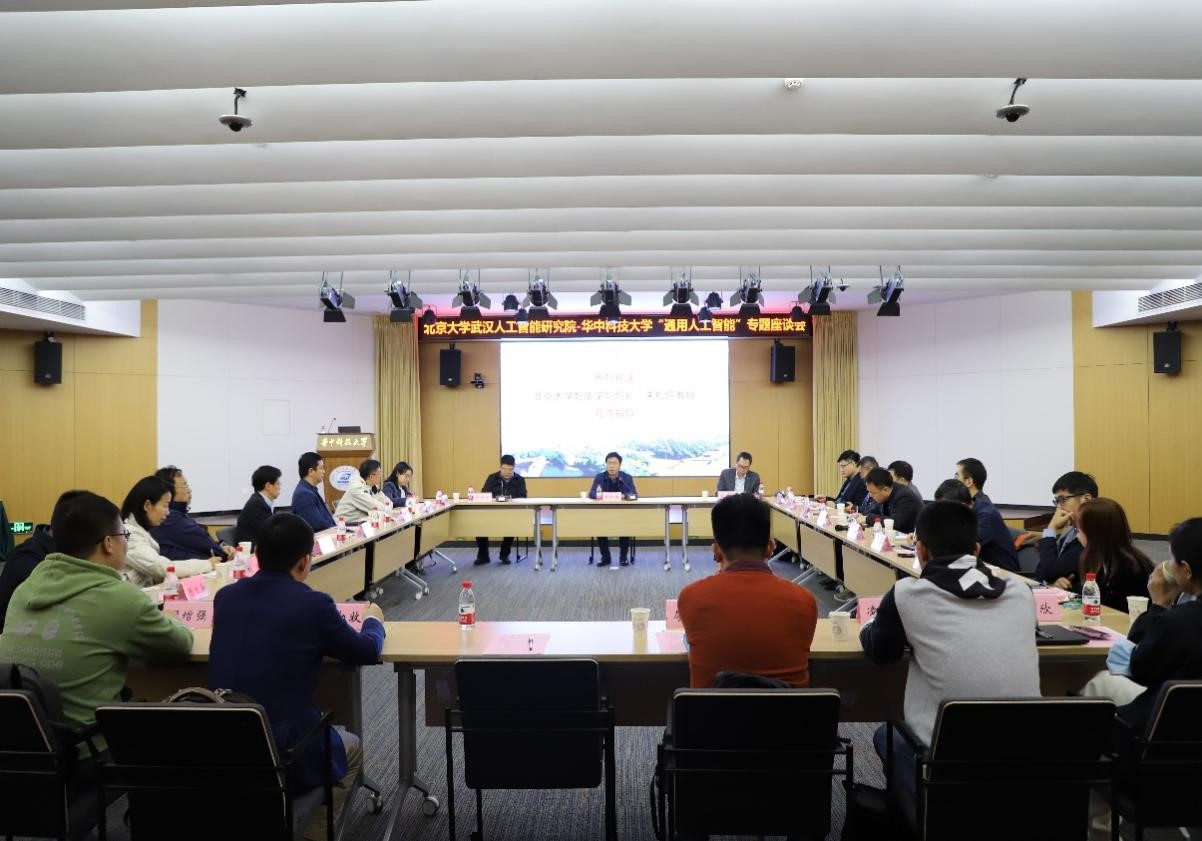 院长邱才明主持座谈会,他对朱松纯教授一行的到来表示热烈欢迎,对与北京大学武汉人工智能研究院的合作充满期待。朱松纯向与会人员介绍了通用人工智能的内涵与外延及北京大学武汉人工智能研究院的基本情况。