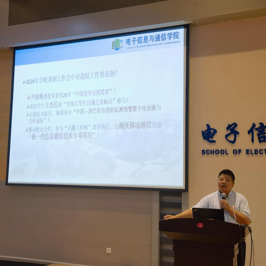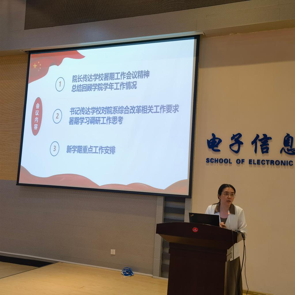 葛茜传达校党委书记张广军所作“重塑目标 勇担使命 奋力书写中国式现代化的华科大篇章”和校长尤政所作“深化教育综合改革 激发创新活力 全面推进教育科技人才一体化”的主题报告等暑期工作会议报告精神,传达学校对院系综合改革相关要求,表示学院将深入学习贯彻党的二十大、二十届三中全会精神和学校暑期工作会议精神,积极深化教育综合改革、深化科技体制改革、深化人事人才制度改革,对标对表学校发展愿景,凝神聚力、勇担使命、踔厉奋发、追求卓越,落实落细学院高质量发展任务清单。同时分享暑期学习调研工作思考,对学院师德师风建设、人事人才、安全、后勤等工作特别是本学期筹办世界元宇宙大会等重要会议进行相关通报和部署。