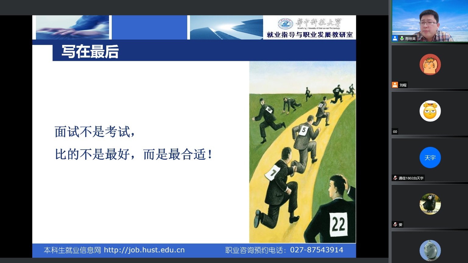 紧接着,陈世英从简历制作与面试技巧两方面展开了求职技巧的培训。他结合简历制作的基础要素,归纳出一个中心、两个突出、三个避免、四个说话、五大部分、六点注意,并结合相关案例开展了细致的讲解。他强调大家在准备简历时应当以求职岗位为中心,针对不同的应聘岗位量身定制,从细节中展示自己。关于面试技巧,陈世英分别从面试前的准备、常见的面试类型、如何应对面试展开讲解。同时他提醒马上要复试的同学们了解面试的流程,做好专业知识的准备,了解意向导师的研究方向,提前准备好有关材料。“事不在大,成功就行;技不在高,相关则灵”,“面试不是考试,比的不是最好,而是最合适”一句句情真意切的话语,回响在电信学子的耳边。